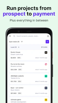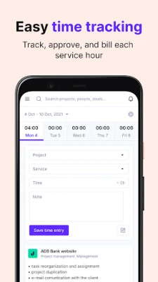 Using the app, you can: - Track time - Create, manage, and comment on tasks for all your projects - View and upload attachments - Track profitability for budgets - Get notifications when something happens on a certain task or deal - Get an overview of your sales pipeline - Manage your contacts - Switch between different organizations you're involved with - ...and much, much more