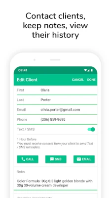 Clients can book appointments from your website, or from a "Book Now" button on your Facebook or Instagram page. With the scheduling app, you can manage your calendar on the go.