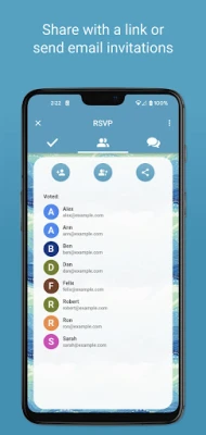 Simply select dates and times you want to suggest for your event and then either send invitation emails to your guests through the app or copy a link to share with your guests on social media or via text messaging.